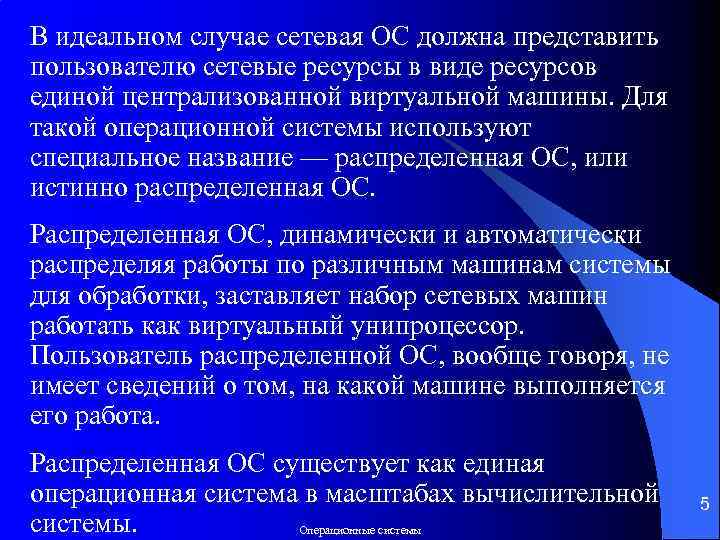 В идеальном случае сетевая ОС должна представить пользователю сетевые ресурсы в виде ресурсов единой централизованной виртуальной машины. Для такой операционной системы используют специальное название — распределенная ОС, или истинно распределенная ОС. Распределенная ОС, динамически и автоматически распределяя работы по различным машинам системы для обработки, заставляет набор сетевых машин работать как виртуальный унипроцессор. Пользователь распределенной ОС, вообще говоря, не имеет сведений о том, на какой машине выполняется его работа. Распределенная ОС существует как единая операционная система в масштабах вычислительной 5 системы. Операционные системы
