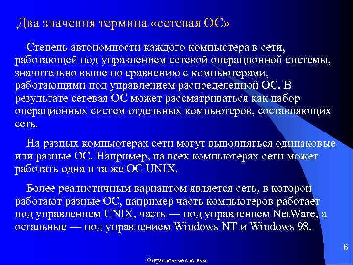 Два значения термина «сетевая ОС» Степень автономности каждого компьютера в сети, работающей под управлением сетевой операционной системы, значительно выше по сравнению с компьютерами, работающими под управлением распределенной ОС. В результате сетевая ОС может рассматриваться как набор операционных систем отдельных компьютеров, составляющих сеть. На разных компьютерах сети могут выполняться одинаковые или разные ОС. Например, на всех компьютерах сети может работать одна и та же ОС UNIX. Более реалистичным вариантом является сеть, в которой работают разные ОС, например часть компьютеров работает под управлением UNIX, часть — под управлением Net. Ware, а остальные — под управлением Windows NT и Windows 98. 6 Операционные системы