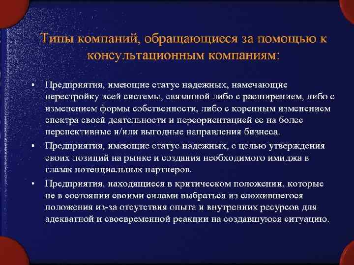 2. Субъекты и объекты консультирования Отличительные черты организации, которая будет применять управленческое консультирование: 1. деятельность организации должна быть ориентирована на потребителей на протяжении всего процесса предоставления продукта. 2. акцент деятельности- долгосрочная прибыльность. 3. необходимо интегрировать и координировать функцию маркетинга с другими корпоративными функциями.