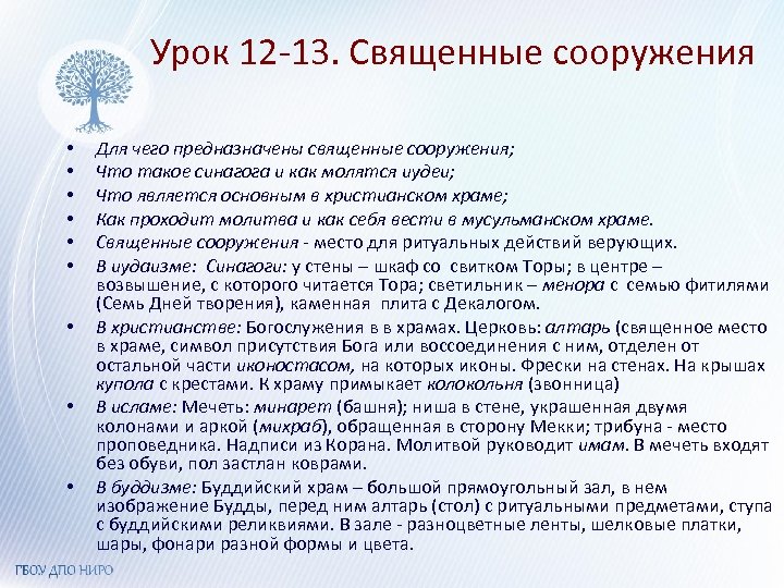 Урок 12 -13. Священные сооружения • • • Для чего предназначены священные сооружения; Что такое синагога и как молятся иудеи; Что является основным в христианском храме; Как проходит молитва и как себя вести в мусульманском храме. Священные сооружения - место для ритуальных действий верующих. В иудаизме: Синагоги: у стены – шкаф со свитком Торы; в центре – возвышение, с которого читается Тора; светильник – менора с семью фитилями (Семь Дней творения), каменная плита с Декалогом. В христианстве: Богослужения в в храмах. Церковь: алтарь (священное место в храме, символ присутствия Бога или воссоединения с ним, отделен от остальной части иконостасом, на которых иконы. Фрески на стенах. На крышах купола с крестами. К храму примыкает колокольня (звонница) В исламе: Мечеть: минарет (башня); ниша в стене, украшенная двумя колонами и аркой (михраб), обращенная в сторону Мекки; трибуна - место проповедника. Надписи из Корана. Молитвой руководит имам. В мечеть входят без обуви, пол застлан коврами. В буддизме: Буддийский храм – большой прямоугольный зал, в нем изображение Будды, перед ним алтарь (стол) с ритуальными предметами, ступа с буддийскими реликвиями. В зале - разноцветные ленты, шелковые платки, шары, фонари разной формы и цвета.