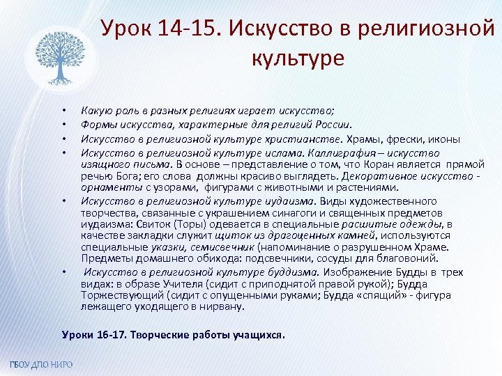 Урок 14 -15. Искусство в религиозной культуре • • • Какую роль в разных религиях играет искусство; Формы искусства, характерные для религий России. Искусство в религиозной культуре христианстве. Храмы, фрески, иконы Искусство в религиозной культуре ислама. Каллиграфия – искусство изящного письма. В основе – представление о том, что Коран является прямой речью Бога; его слова должны красиво выглядеть. Декоративное искусство орнаменты с узорами, фигурами с животными и растениями. Искусство в религиозной культуре иудаизма. Виды художественного творчества, связанные с украшением синагоги и священных предметов иудаизма: Свиток (Торы) одевается в специальные расшитые одежды, в качестве закладки служит щиток из драгоценных камней, используются специальные указки, семисвечник (напоминание о разрушенном Храме. Предметы домашнего обихода: подсвечники, сосуды для благовоний. Искусство в религиозной культуре буддизма. Изображение Будды в трех видах: в образе Учителя (сидит с приподнятой правой рукой); Будда Торжествующий (сидит с опущенными руками; Будда «спящий» - фигура лежащего уходящего в нирвану. Уроки 16 -17. Творческие работы учащихся.