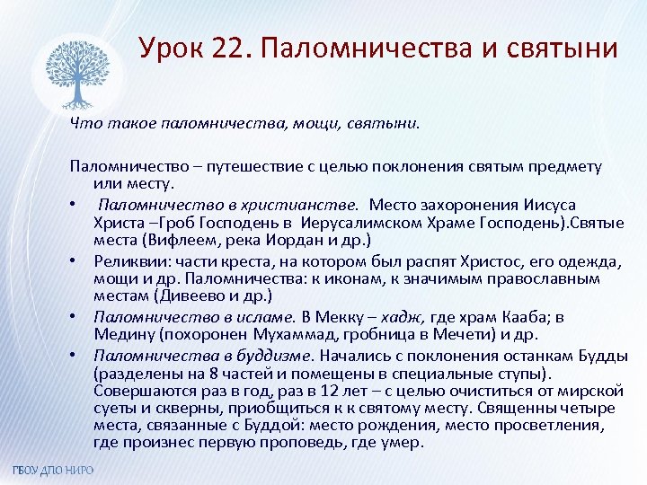 Урок 22. Паломничества и святыни Что такое паломничества, мощи, святыни. Паломничество – путешествие с целью поклонения святым предмету или месту. • Паломничество в христианстве. Место захоронения Иисуса Христа –Гроб Господень в Иерусалимском Храме Господень). Святые места (Вифлеем, река Иордан и др. ) • Реликвии: части креста, на котором был распят Христос, его одежда, мощи и др. Паломничества: к иконам, к значимым православным местам (Дивеево и др. ) • Паломничество в исламе. В Мекку – хадж, где храм Кааба; в Медину (похоронен Мухаммад, гробница в Мечети) и др. • Паломничества в буддизме. Начались с поклонения останкам Будды (разделены на 8 частей и помещены в специальные ступы). Совершаются раз в год, раз в 12 лет – с целью очиститься от мирской суеты и скверны, приобщиться к к святому месту. Священны четыре места, связанные с Буддой: место рождения, место просветления, где произнес первую проповедь, где умер.