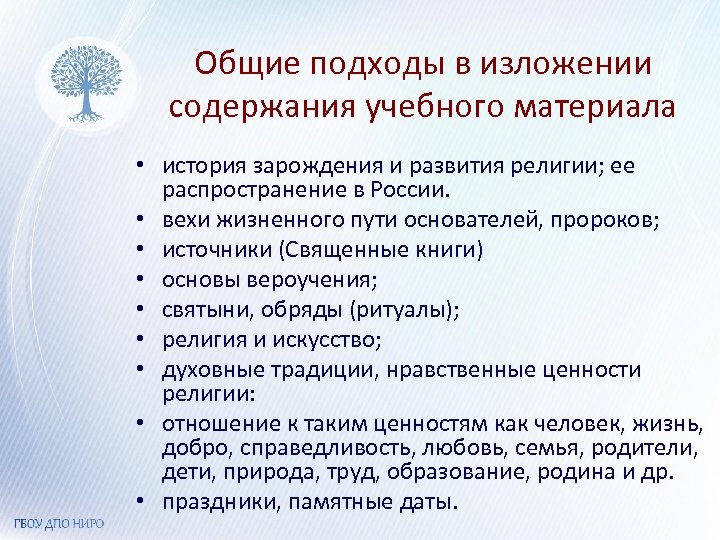 Общие подходы в изложении содержания учебного материала • история зарождения и развития религии; ее распространение в России. • вехи жизненного пути основателей, пророков; • источники (Священные книги) • основы вероучения; • святыни, обряды (ритуалы); • религия и искусство; • духовные традиции, нравственные ценности религии: • отношение к таким ценностям как человек, жизнь, добро, справедливость, любовь, семья, родители, дети, природа, труд, образование, родина и др. • праздники, памятные даты.