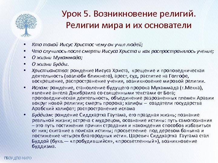 Урок 5. Возникновение религий. Религии мира и их основатели • • Кто такой Иисус Христос чему он учил людей; Что случилось после смерти Иисуса Христа и как распространялось учение; О жизни Мухаммада; О жизни Будды. Христианство: рождение Иисуса Христа, крещение и проповедническая деятельность (возлюби ближнего), арест, суд, распятие на Голгофе, воскрешение, распространение учения, возникновение мировой религии. Ислам: рождение, становление будущего пророка Мухаммада (г. Мекка), явление ангела Джибраила со священными текстами от Бога; проповедническая деятельность, объединение разрозненных племен Аравии вокруг новой религии; смерть пророка; халифы – создатели государства Арабский халифат; распространение ислама Буддизм: рождение Сиддхартха Гаутама, его праздная жизнь; познание реальной жизни; встреча с мудрецом, осознание истины: путь самопознания – это путь постижения причин страдания и нахождения способов избавиться от них; скитание в поисках истины; просветление под деревом баньяна и постижение четырех благородных истин. Царевич Сиддхартха Гаутама стал Буддой (букв. — «пробудившийся» , «просветленный» ), возникновение буддизма.