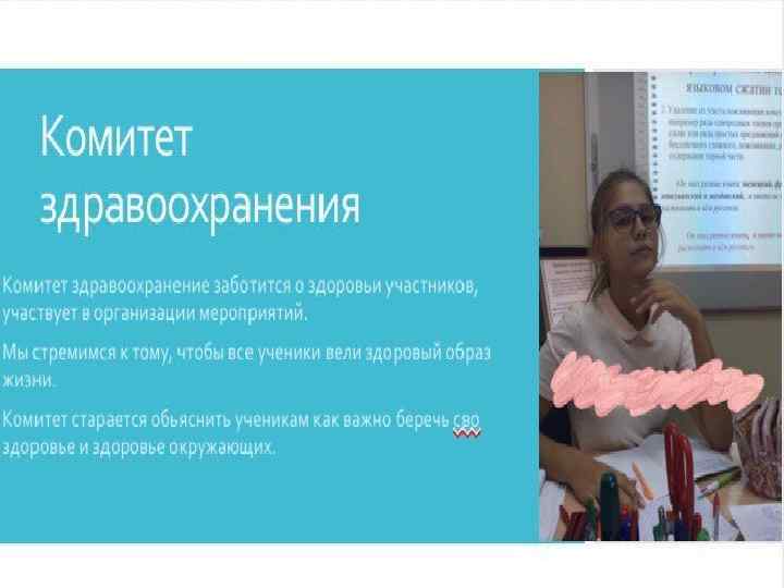 Комитет информационных технологий и связи с общественностью Здравствуйте, я Елизавета Ляшенко, учащаяся 8 "А" класса и представитель комитета информационных технологий и связи с общественностью. Мой комитет включает в себя следующее: организацию оформительной работы, фотоотчеты, курирование информационной работы, художественное оформление школы и участие в творческих работах.