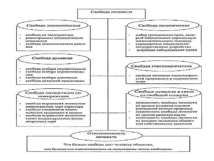 УЧЕНИЕ О ЧЕЛОВЕКЕ. ВОПРОС № 5 В) СВОБОДА И ОТВЕТСТВЕННОСТЬ СВОБОДА «ОТ» И СВОБОДА «ДЛЯ» «СВОБОДА ОТ» (свобода как дозволенность) возможность действовать без ограничений. В частности, без ответственности. Подразумеваются внешние рамки и ограничения, стесняющие жизнедеятельность человека, от которых он хотел бы избавиться. Зачастую люди хотят иметь свободу и иметь же возможность не отвечать за свои поступки. Это есть свобода, подпитанная безответственностью. Зовётся она уже произволом. «СВОБОДА ДЛЯ» (свобода как обязанность) это существенно другое определение свободы. Оно апеллирует к сознательной социально нравственной активности, направленной на реализацию жизненных целей и принципов, за осуществление которых личность чувствует себя персонально ответственной и которые не разобщают, а соединяют ее с другими. Г. Л. Тульчинский: «Границы свободы и ответственности совпадают, как две стороны одного листа бумаги. Только там, где я свободен, где мною свободно приняты решения, свободно совершены действия, я и отвечаю за них и их последствия. И наоборот я могу быть ответствен только за то, в чем проявилась моя свобода» . • • ОТВЕТСТВЕННОСТЬ ЛИЧНОСТИ Личность является ответственной за все совершаемые ею поступки. Здесь подразумевается то, что она выступает как свободный агент и источник своих действий. Личность должна осознавать последствия своих поступков и ответственность за них. Личность должна возместить причиненный вред. Личность должна осознавать свои возможности возмещения вреда. Нельзя, например, восполнить утрату человека для его близких.