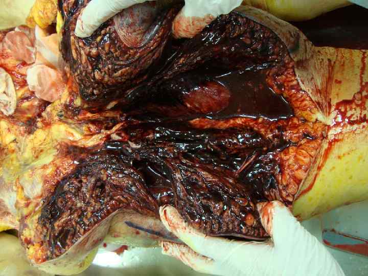 С-53 -10, и/б: 6308/С 2010, ОА-Р № 2 , 11 к/д МАЛЫГИН В. П. , 78 лет. КЛИНИЧЕСКИЙ ДИАГНОЗ: ОСН. ЗАБОЛЕВАНИЕ ИБС. ОИМ РТСА со стентированием Рецидив ИМ ОСЛОЖНЕНИЯ Кардиогенный шок Синдром Мэллори. Вейса. Острое желудочное кровотечение Кишечное кровотечение. Перфорация сигмовидной кишки. Лапаротомия, резекция сигмовидной кишки. Колостома. Гематома правой паховой области, забрюшинная гематома ПАТОЛОГОАНАТОМИЧЕСКИЙ ДИАГНОЗ: ОСНОВНОЕ ЗАБОЛЕВАНИЕ (сочетанные болезни) ИБС: атеросклероз артерий сердца , трансмуральный рецидивирующий ареактивный инфаркт Атеросклероз аорты, аневризма брюшной Ао с тромбозом, хронический ишемический колит с обострением по типу флегмонозно-язвенного, перфорацией стенки (О-8231 -50), лапаротомия, резекция сигмовидной кишки. ОСЛОЖНЕНИЯ Фибринозно-гнойный и каловый перитонит. не распознано одно из сочетанных заболеваний, причина- недообследование