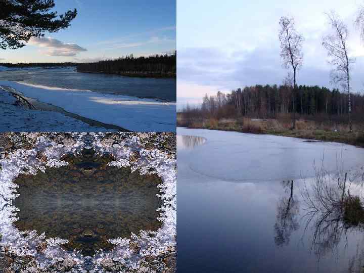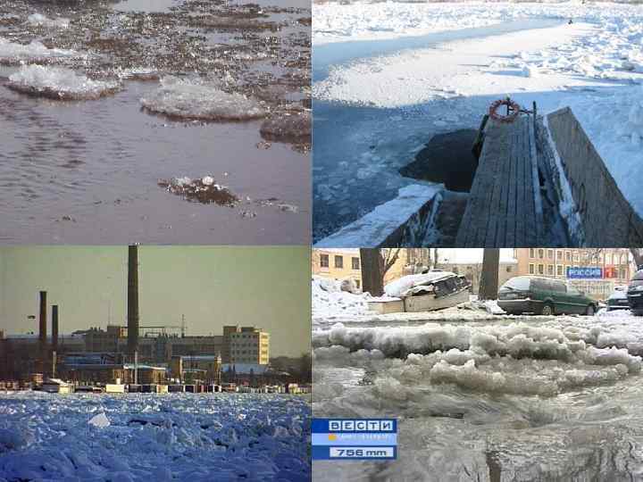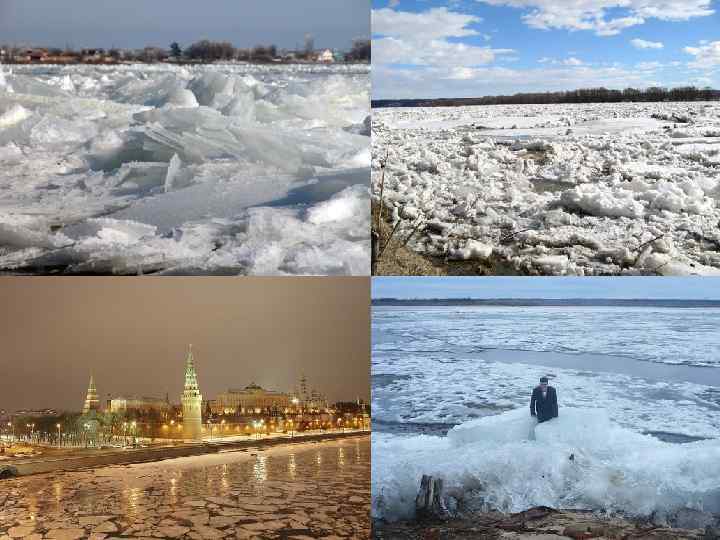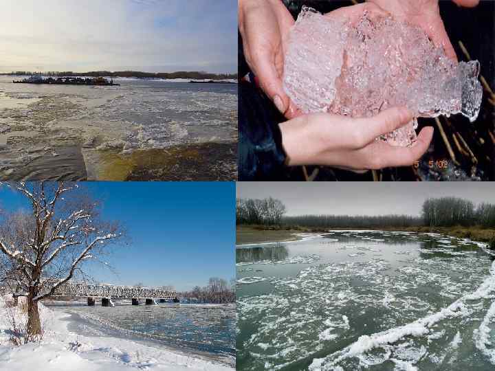 Вскрытие • Вскрытие рек начинается близ берегов под влиянием солнечных лучей, тепла атмосферы и поступающих в реку талых вод. Приток талых вод вызывает подъем уровня, лед всплывает, отрываясь от берегов, и вдоль берегов протягивается полоса воды без льда – закраина. • Лед начинает смещаться вниз по течению, сначала происходят подвижки льда, а затем весенний ледоход. • На реках, текущих с севера на юг, ледоход проходит спокойно. Для рек, текущих с юга на север, свойственны высокое половодье, заторы, разрушение льдом берегов. • На реках, вытекающих из озер, часто наблюдается два ледохода – сначала идет речной лет, затем озерный.