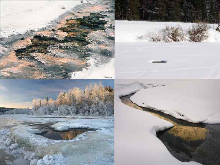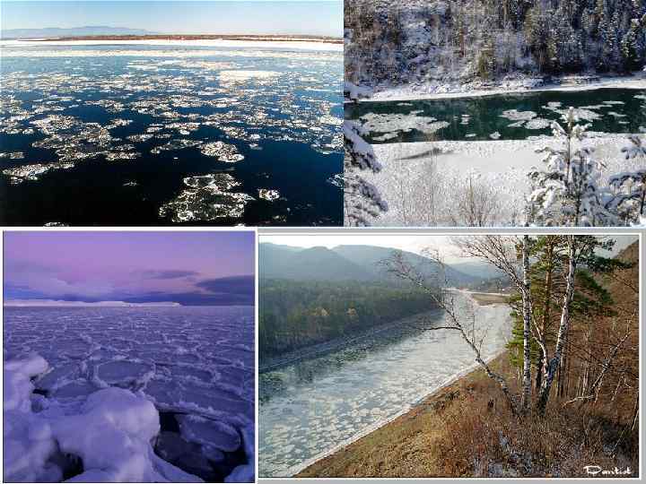 Ледостав • Установление на реке сплошного устойчивого ледяного покрова носит название ледостава. Ледяной покров и лежащий на нем снег предохраняют воду от дальнейшего охлаждения. Если зима холодная, то лед нарастает снизу, уменьшая живое сечение реки и увеличивая давление на воду, которая может излиться наружу и увеличивать мощность льда сверху. • В результате быстрого течения или вследствие притока более теплой воды на некоторых реках в течение всей зимы могут сохраняться полыньи (майны).