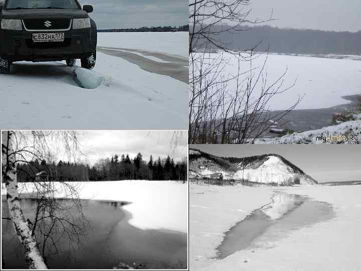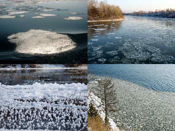 Замерзание • Зимой при охлаждении воды несколько ниже температуры ее замерзания начинается процесс льдообразования. • В спокойно текущей реке прежде всего возникают забереги. Одновременно с ними или несколько позже на поверхности образуется сало. Сало и забереги смерзаются в сплошной ледяной покров реки. • При быстром движении воды процесс замерзания задерживается ее перемешиванием и вода может переохлаждаться на несколько сотых градуса. При этом в толще воды возникают мелкие кристаллики. Они вместе с салом и снежурой образуют шугу. • Процесс кристаллизации у дна приводит к возникновению донного льда, который может отрываться и всплывать. • Скапливаясь подо льдом, шуга, всплывший донный лед, сало, снежура могут закупорить русло и возникает зажор. Осенью они создают осенний ледоход, во время которого (как и весной) на поворотах рек, в сужениях русла, у опор мостов образуются заторы, вызывающие, как и зажоры, подъемы уровня воды.