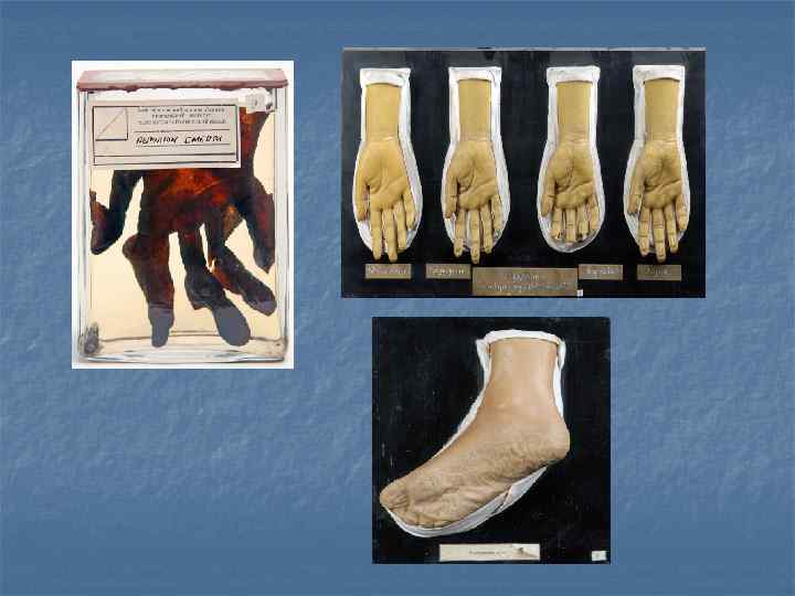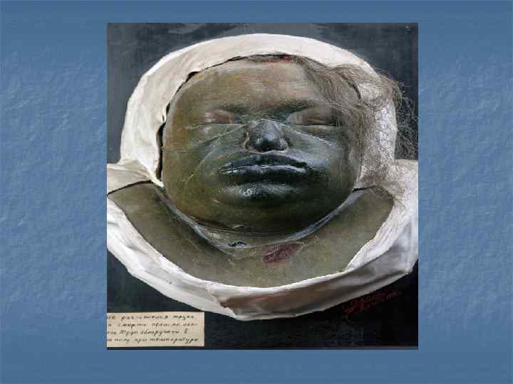 Поздние трупные явления n Гиение - сложный процесс самопереваривания тканей, вызванный действием протеолитических ферментов, без участия микроорганизмов. n Мумификация – это процесс обезвоживания тканей и органов трупа и их высыхание. Полная мумификация трупа взрослого человека может пройти за 6 -12 мес. , при «благоприятных» условиях за 2 -3 мес. Жировоск – в основе образования жировоска лежит разложение жировой клетчатки на глицерин и жирные кислоты с последующим омылением этих кислот. Превращение трупа взрослого человека в жировоск требуется 10 -12 мес. , для новорожденного – 3 -4 мес. n n Торфяное дубление –процесс поздней консервации трупа под воздействием гумусовых кислот и других дубящих веществ.