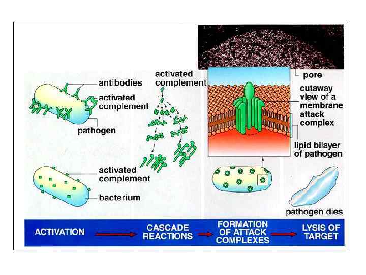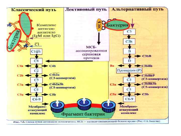 Система комплемента • Комплемент- это сложный комплекс белков (около 20), которые формируют каскадную ферментную систему. Компоненты комплемента обозначаются буквой С (С 1, С 2, С 3. . . С 9). В норме компоненты комплемента находятся в сыворотке крови в неактивном состоянии. Сутью каскадной активации системы комплемента является то, что каждый из первых пяти компонентов в результате активации превращается в фермент, который расщепляет следующий компонент и предоставляет ему свойств фермента. Система комплемента активируется по разному в зависимости от того, или в организме уже синтезировались антитела на данный агент, или таких антител еще нет. Поэтому различают классический путь активации комплемента (при наличии антител) и альтернативный путь (при их отсутствии).