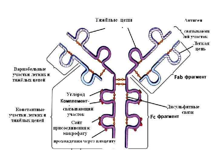 У каждого иммуноглобулина - только один тип легких цепей или , или . Таким образом, структурные формулы каждого класса иммуноглобулина можна записать таким образом: Тяжелые цепи Класс иммуноглобулинов Ig G Ig M Ig A Ig E Ig D Ig G - 2 2, , 2 2 Ig M - ( 2 2)5, ( 2 2)5 Ig A - ( 2 2)n , ( 2 2)n, , Ig E - 2 2, 2 2 Ig. D - 2 2, 2 2