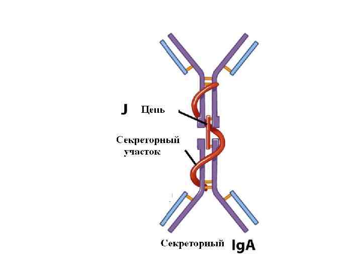 Ig. А. Различают сывороточные и секреторные Ig. А. Сывороточные Ig. A могут иметь структуру мономера (80 % ), димера- или полимера. У последних двух есть дополнительная цепь J, которая объединяет эти мономеры. Сывороточные иммуногло- булины А составляют 10 -20 % всех иммуноглобулинов сыворотки. • Секреторные иммуноглобулины чаще всего бывают в виде димера, к которому присоединяется секреторный компонент (СК-фрагмент), который защищает Ig. A от разрушения протеазами. •