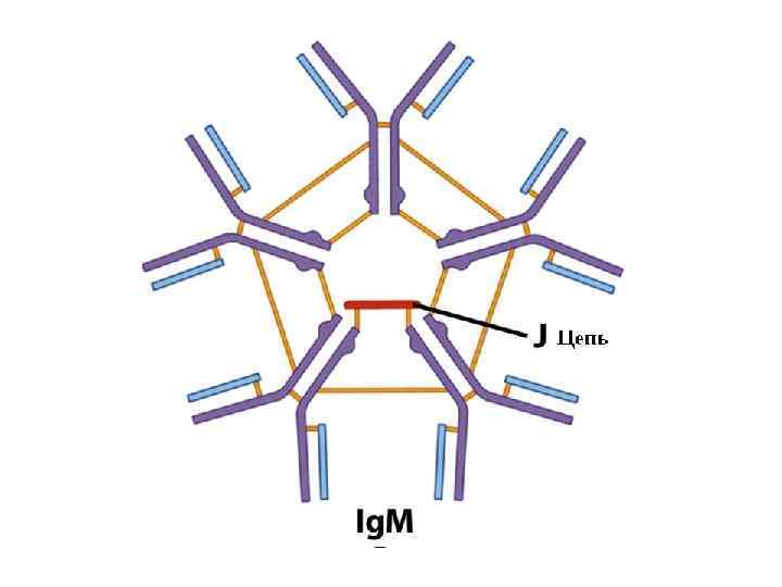 Ig. M. Иммунный ответ организма начинается из синтеза Ig. M. Они синтезируются быстро, но иммунологическая память клеток, которые их синтезируют либо отсутствует, либо сохраняется кратковременно. Период полураспада - 5 суток. Ig. M содержит дополнительную цепь J, которая объединяет 5 мономеров в одну структуру. Ig. M имеет 10 активных центров и дополнительный домен СH 4, который активно фиксирует комплемент. Основным источником Ig. M является селезенка. Ig. M находится в крови и секретах, и им, в основном, обусловлены бактерицидные свойства этих веществ.