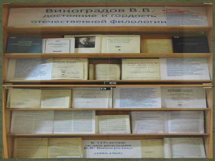 В. В. Виноградов многие годы работал над монографией, посвященной истории слов и устойчивых выражений, задуманной им как исследование путей развития русской лексики и фразеологии в ее неразрывной связи с историей общественной мысли и культуры русского народа. Профессор Ленинградского (1920 -29) и Московского (1930 -1969) университетов: заведующий кафедрой русского языка МГУ (1945 -1969), директор Института языкознания (1950 -1954), Института русского языка (1958 -1968); академик-секретарь Отделения литературы и языка (1950 -1963); редактор журнала "Вопросы языкознания" (с 1952); заведующий сектором исторической поэтики и стилистики русской классической литературы в Институте русской литературы (Пушкинском доме) (с 1968). Был членом Главной редакции 2 -го изд. Большой советской энциклопедии. Автор исследований по русской грамматике: "Русский язык. Грамматическое учение о слове" (1947); по истории русского языка: "Очерки по истории русского литературного языка XVII-XIX вв. " (1934, 2 изд. 1938), а также монографических работ о языке и стиле русских писателей 19 -20 вв. , о "натуральной школе" и др. Теоретическому анализу вопросов стилистики и поэтики на основе материала русской литературы посвящены книги "О художественной прозе" (1930), "О языке художественной литературы" (1959) и "Стилистика. Теория поэтической речи. Поэтика" (1963). Участвовал в составлении "Толкового словаря русского языка" под редакцией Д. Н. Ушакова (1935 -1940), в редактировании словарей русского языка, (1957 -1961). Руководил работой по составлению "Словаря языка Пушкина" (1956 -1961). Был членом многих иностранных академий, председателем международного комитета славистов (с 1957). Награждён орденом Ленина, 2 другими орденами, а также медалями.