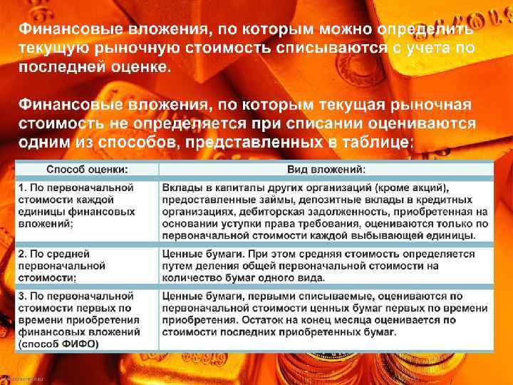 Для принятия к бухгалтерскому учету активов в качестве финансовых вложений необходимо единовременное выполнение условий: • наличие надлежаще оформленных документов, подтверждающих существование права у организации на финансовые вложения и на получение денежных средств или других активов, вытекающее из этого права; • переход к организации финансовых рисков, связанных с финансовыми вложениями (риск изменения цены, неплатежеспособности должника, ликвидности и др. ); • способность приносить организации экономические выгоды (доход) в будущем в форме процентов, дивидендов либо прироста стоимости.