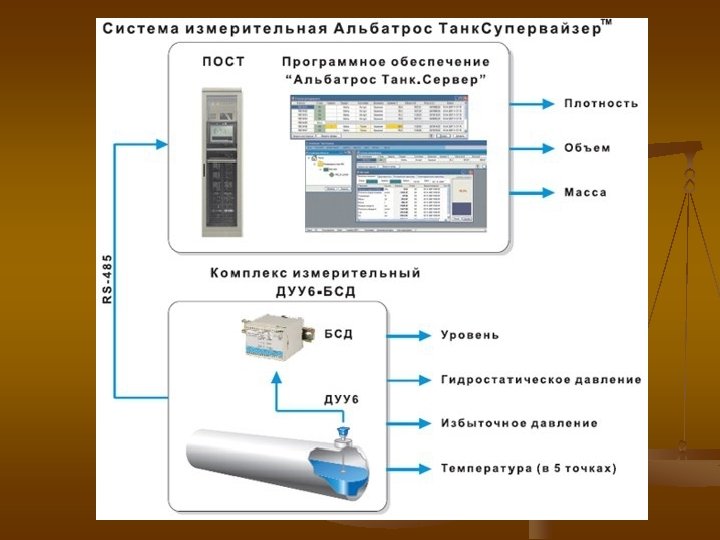 Коммерческий учет нефтепродуктов / Система измерительная Альбатрос Танк. Супервайзертм n n n 1. 1 В условиях хранения нефтепродукта, в том числе неоднородного состава наиболее практичным с точки зрения затрат и точности количественного/коммерческого учета является метод определения массы, основанный на гидростатическом принципе. Коммерческий учет нефтепродуктов может быть реализован с помощью измерительной системы Альбатрос Танк. Супервайзертм (далее «система» ), в которой применяется этот метод. Эта система может являться как основным, так и дополнительным оборудованием для АЗС. Результаты измерений системы могут быть использованы для выполнения учётных операций и управления технологическими процессами. Структура системы представлена на рисунке 1. Рисунок 1 – Структура системы 1. 2 Система Альбатрос Танк. Супервайзертм измеряет: - уровень; - температуру; - гидростатическое давление столба продукта. Система на основе измеренных параметров выполняет расчет: - объема жидкости по градуировочным таблицам резервуара; - плотности и массы продукта в мере вместимости. Система Альбатрос Танк. Супервайзертм представляет собой оборудование для АЗС, полностью удовлетворяющее требованиям существующего стандарта для учетных операций при хранении нефти и нефтепродуктов (ГОСТ Р 8. 595 -2004).