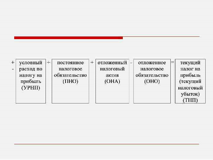 o ТНП = УРНП + ПНО + ОНА - ОНО, n n n ТНП - текущий налог на прибыль; УРНП - условный расход по налогу на прибыль; ПНО - постоянное налоговое обязательство; ОНА - отложенный налоговый актив (при расчете берется в виде разницы между дебетовым и кредитовым оборотами по счету 09; если кредитовый оборот превышает дебетовый оборот, то разница учитывается со знаком «плюс» , если наоборот, то со знаком «минус» ); ОНО - отложенное налоговое обязательство (при расчете берется в виде разницы между кредитовым и дебетовым оборотами по счету 77; если дебетовый оборот превышает кредитовый оборот, то разница учитывается со знаком «плюс» , если наоборот, то со знаком «минус» ).