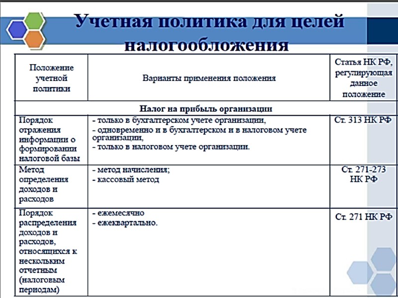Выбранные способы устанавливаются на длительный срок (как минимум на год); В пределах налогового периода учетная политика организации не может изменяться, кроме случаев прямо предусмотренных законодательством о налогах и сборах (например, при внесении изменений в законодательство, затрагивающее принятую учетную политику). В отношении НДС и акцизов (налоговый период по акцизам – календарный месяц, по НДС - квартал) учетную политику для целей налогообложения также рекомендуется сохранять в течение как минимум года.