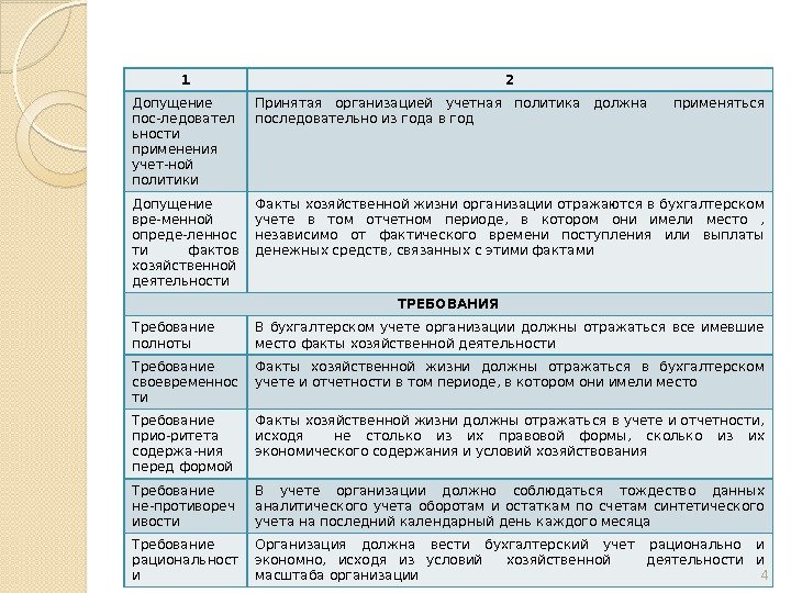 1 2 Допущение пос-ледовател ьности применения учет-ной политики Принятая организацией учетная политика должна применяться последовательно из года в год Допущение вре-менной опреде-леннос ти фактов хозяйственной деятельности Факты хозяйственной жизни организации отражаются в бухгалтерском учете в том отчетном периоде, в котором они имели место , независимо от фактического времени поступления или выплаты денежных средств, связанных с этими фактами ТРЕБОВАНИЯ Требование полноты В бухгалтерском учете организации должны отражаться все имевшие место факты хозяйственной деятельности Требование своевременнос ти Факты хозяйственной жизни должны отражаться в бухгалтерском учете и отчетности в том периоде, в котором они имели место Требование прио-ритета содержа-ния перед формой Факты хозяйственной жизни должны отражаться в учете и отчетности, исходя не столько из их правовой формы, сколько из их экономического содержания и условий хозяйствования Требование не-противореч ивости В учете организации должно соблюдаться тождество данных аналитического учета оборотам и остаткам по счетам синтетического учета на последний календарный день каждого месяца Требование рациональност и Организация должна вести бухгалтерский учет рационально и экономно, исходя из условий хозяйственной деятельности и масштаба организации