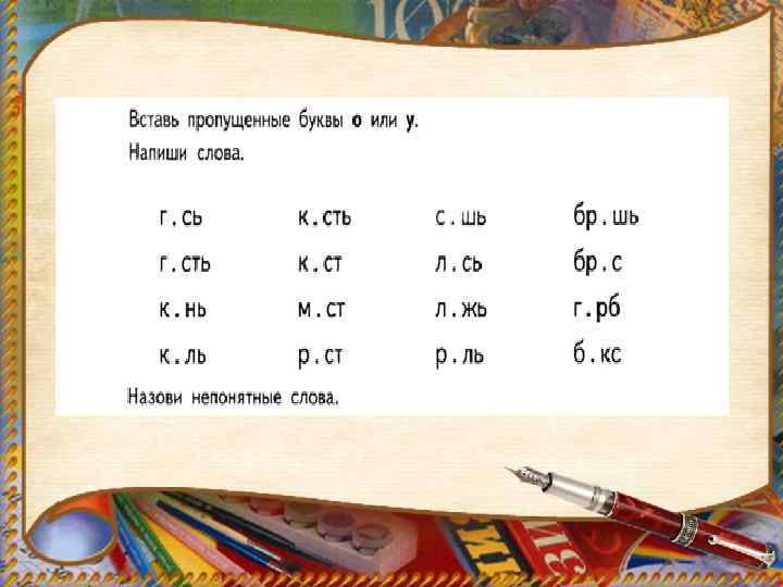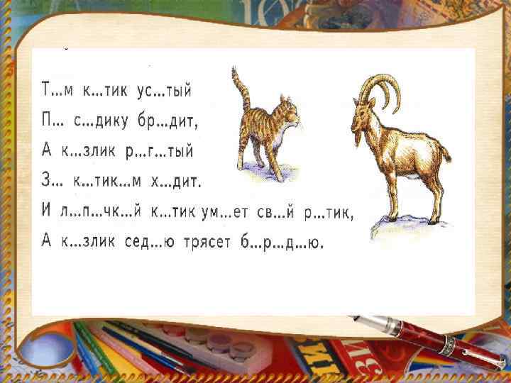 Пропущенные буквы Выполняя это упражнение предлагается пользоваться текстом подсказкой, где все пропущенные буквы на своих местах. Упражнение развивает внимание и уверенность навыка письма.
