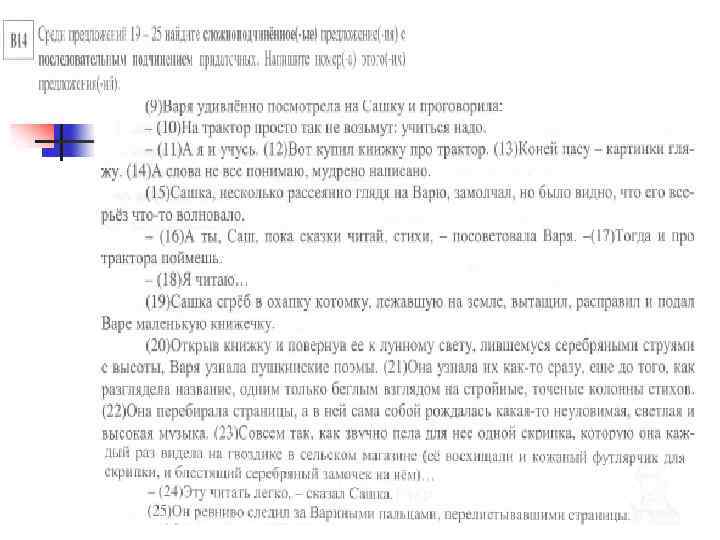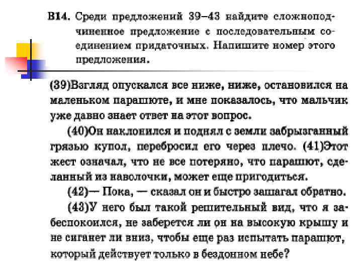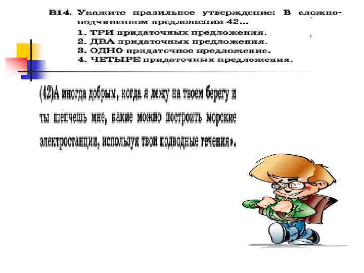 n n n Комбинированное подчинение В сложноподчиненном предложении с большим количеством придаточных возможно комбинированное подчинение (однородное и параллельное, однородное и последовательное, последовательное и параллельное; однородное, последовательное и параллельное). Например: Вечером буря разыгралась так, что нельзя было расслышать, гудит ли ветер или гремит гром (И. Гончаров) (последовательное и однородное подчинение) [ – = ], (что = ), ( = ли – ) или ( = –). (последовательное и однородное подчинение). Чтобы идти вперед, чаще оглядывайтесь назад, иначе вы забудете, откуда вы шли, и куда вам нужно идти (Л. Андреев). (Чтобы = ), [ = ], (ибо – =), (откуда – = ), и (куда = ). (однородное, параллельное и последовательное подчинение).