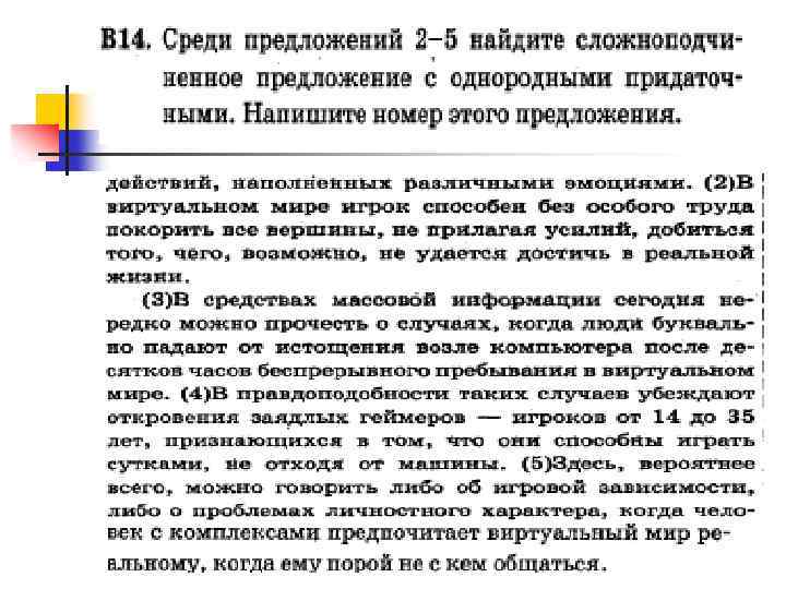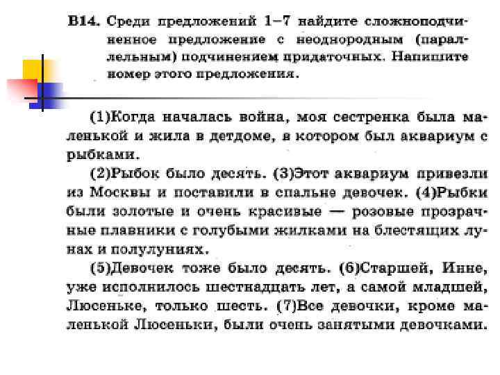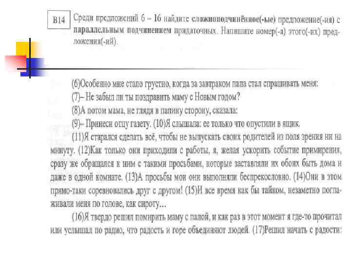 Неоднородное (параллельное) подчинение Если из двух условий однородного подчинения выполняется только одно, а другое нет, то мы имеем дело с неоднородным (параллельным) подчинением. Таким образом, придаточные при неоднородном подчинении либо относятся к чему-то одному, но при этом являются придаточными разного типа, любо, являясь придаточными одного типа (обычно это придаточные определительные), относятся к разным словам. Например: Когда мы встали, то нельзя было понять, который час (А. Чехов). (Когда – = ), [то = ], (который – ).