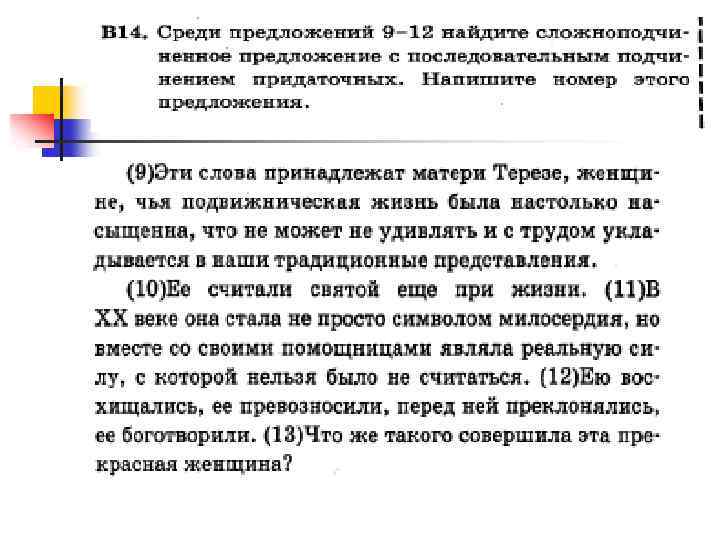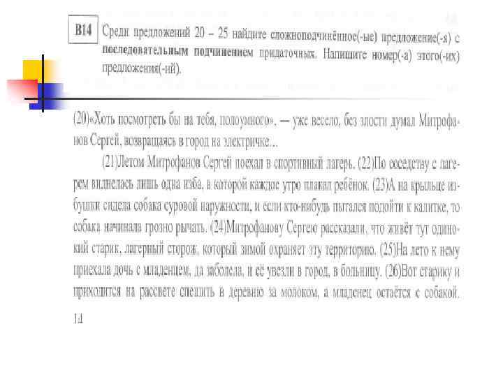 n n Последовательное подчинение При последовательном подчинении придаточные предложения связываются между собой словно по цепочке: первое придаточное относится к главному предложению (это придаточное I степени), второе придаточное относится к первому (придаточное II степени), третье - ко второму (придаточное III степени) и т. д. Например: Был прекрасный июльский день, один из тех дней, которые случаются тогда, когда погода установилась надолго (И. Тургенев). [ = – ], (которые = ), (когда – =). При последовательном подчинении возможно стечение двух подчинительных союзов или подчинительного союза и союзного слова (что если, что когда, что зачем и т. д. ). В таких случаях второе придаточное оказывается внутри первого. Случилось так, что, когда мы ехали, не было ни малейшей зыби (М. Пришвин). [ = ], (что, (когда – = ), = )