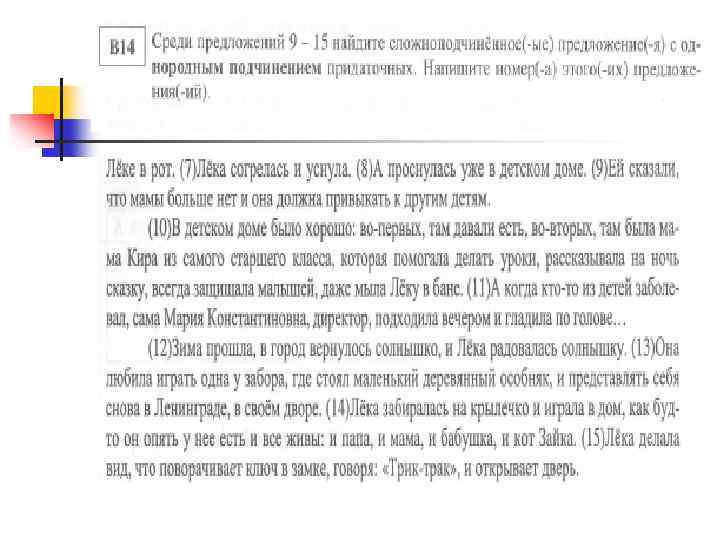n n n Однородное подчинение Подчинение считается однородным, а придаточные - однородными при двух условиях: Если придаточные относятся о всему главному предложению или к одному и тому же слову. Являются придаточными одного типа. Пример: Она знала, что девочки с опаской поглядывают на закрытую дверь комнаты, что чувствуют они себя связанно. . . (Ю. Герман). [ – = ], (что – = ), (что = – ). . . n n Примечание Подчинительный союз (или союзное слово) во втором из однородных придаточных может отсутствовать, но его легко восстановить по первому придаточному, например: Ему [Егорушке] уже не было страшно, хотя гром трещал по прежнему, и (хотя) молния полосовала все небо (А. Чехов). [ – = ], (хотя – = ), и ((хотя) – = ).