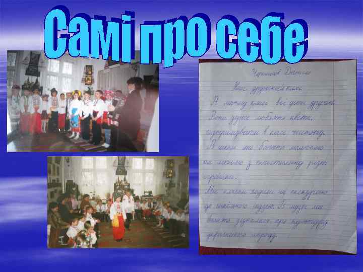 З учнівських творів § Я вважаю, що вчитися – це класно! Холодова Милана § § Мені подобається математика, бо я обожнюю задачі і працювати у парах. Люблю ігри, де треба змагатися. Боровський Олександр § Мені подобається урок читання, тому що там не писати, а читати. Харченко Аліна § Мені дуже подобається фізкультура, тому що там зарядка, розваги, можна пограти в футбол. Герман Артур Мені подобається бути учасником гри. Черемісов Данило § § Мені подобається на уроці математики самостійна робота Петрова Вікторія § Мені подобається працювати в парах. Я люблю розмовляти! Мені подобається пояснювати своїй подрузі або другові та відповідати на різні питання. Тахтарова Анна § Мені подобається урок математики, тому що в ньому багато прикладів і задач. В ігри я люблю грати після уроку. Семенов Михайло § Мені подобаються ігри, де треба змагатися, колективно виконувати одну роботу, вчити товариша. Кочуменко Дмитро § Мені подобається працювати в парах і групах, тому що ми, як вчителі! Федосєєва Анастасія § Я вважаю, що і на уроках треба грати. Сосєдко Аліна Мені подобається урок української мови. Я люблю писати, змагатися. Касьяненко Анастасія § Я вважаю, що в школі весело! Коцубанова Ганна