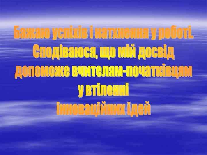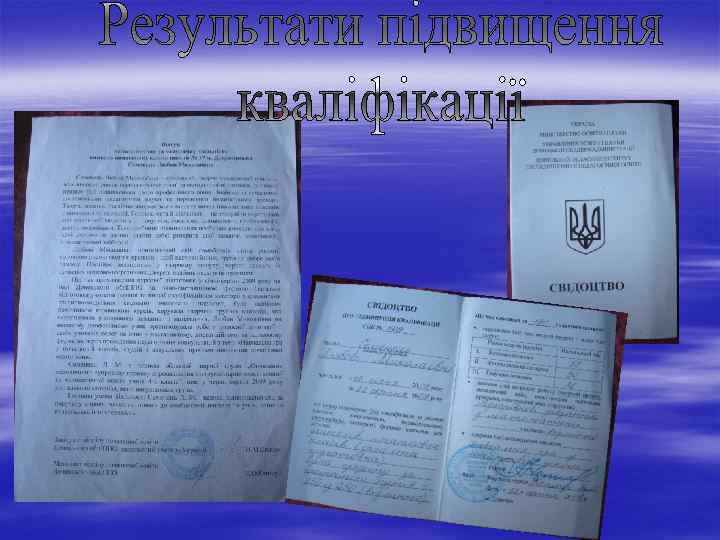 Методична робота Керівництво творчою групою вчителів під час курсів на базі Донецького ІППО у січні-серпні 2009 р. Робота в обласній творчій групі “Оновлення методичного супроводу процесу впровадження інструментарію якості мовної та математичної освіти учнів 4 класів” 2009 р. Наставник молодого вчителя Бойко Ірини Федорівни 2008 -2009 н. р. Робота зі студентомпрактикантом Слов’янського державного педагогічного університету Гончаровою О. М. вересень, 2010 р, Ващук Ю. Співпраця в шкільному та міському методоб’єднанні. Проведення відкритих уроків на семінарах.