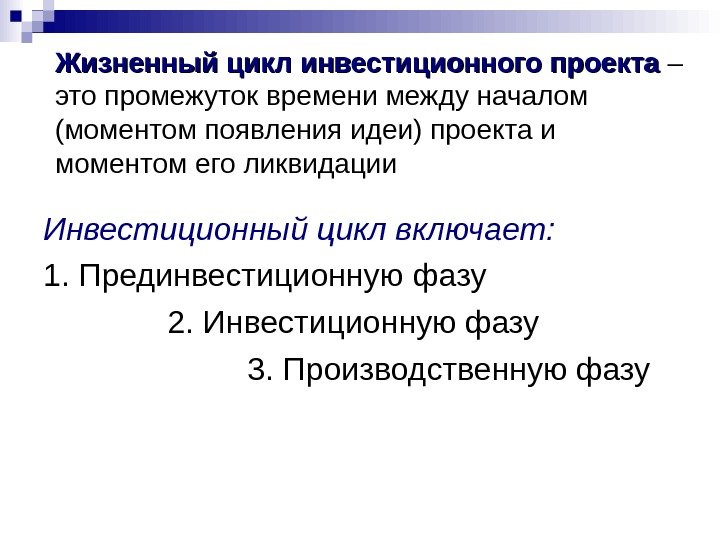 Жизненный цикл инвестиционного проекта – это промежуток времени между началом (моментом появления идеи) проекта и моментом его ликвидации Инвестиционный цикл включает: 1. Прединвестиционную фазу 2. Инвестиционную фазу 3. Производственную фазу