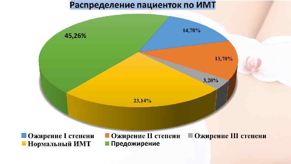 Распределение пациенток по ИМТ Нормальный ИМТ 18, 5 – 24, 9 22 (23, 14%) ИМТ (25 - 30) ИМТ (30 - 35) ИМТ (35 - 40) 43 (45, 26%) 14 (14, 70%) 13 (13, 70%) ИМТ > 40 3 (3, 20%)