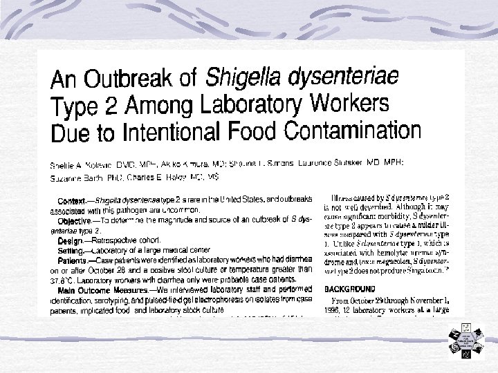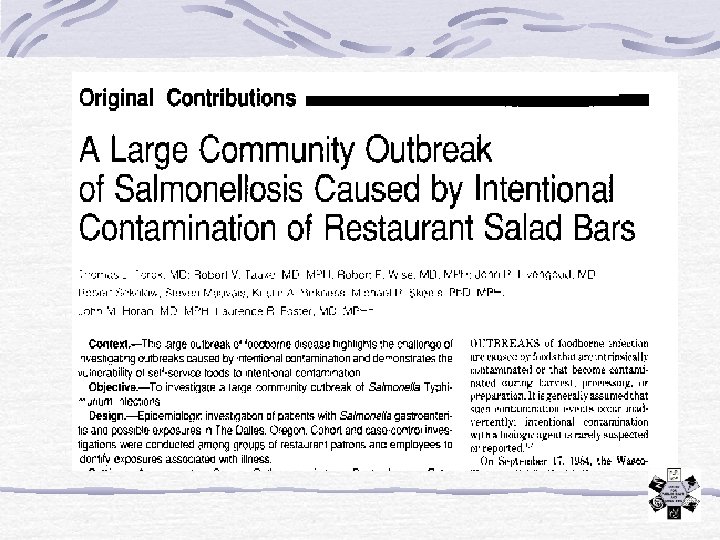 Additional Print Resources Pavlin J. Epidemiology of bioterrorism. Emerging Infectious Diseases. 1999; 5: 528 -530 Macintyre AG, Christopher GW, Eitzen E et al. Weapons of Mass Destruction Events with Contaminated Casualties: Effective Planning for Health Care Facilities. JAMA. 2000; 283: 242 -249. Meltzer MI, Damon I, Le. Duc JW, and Millar JD. Modeling potential responses to smallpox as a bioterrorist weapon. Emerging Infectious Diseases. 2001; 7(6): 959 -969. Di. Giovanni C Jr. Domestic terrorism with chemical or biological agents: psychiatric aspects. Am J Psychiatry 1999; 156: 1500 -5.