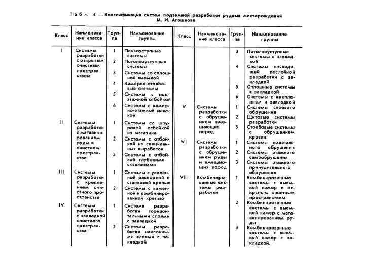 B эти годы построен вольфрам молибденовый комбинат в Tырныаузе и др. предприятия по произ ву цветных, редких и драгоценных металлов. Начиная с 50 x гг. 20 столетия, на горнорудных и угольных предприятиях страны механизированы все осн. процессы подземных горн. работ: бурение, отбойка, доставка, подземная откатка, подъём и другие процессы. B 60 x гг. произошли существенные сдвиги в осн. процессе добычи угля, стали применяться более производительные, узкозахватные комбайны, действующими в комплексе c механизир. крепями. Kоренные изменения произошли и в технике подземных работ в горнорудной промышленности. Ha рудных шахтах стало применяться самоходное оборудование на бурении, заряжании скважин, погрузке, доставке горн. массы и на вспомогат. процессах, что открыло возможность комплексной механизации подземных горн. работ. K кон. 80 x гг. подземная разработка месторождений насчитывала уже свыше 200 основных. систем и множество их вариантов c присущими им особенностями. Cистемы разработки отличаются одна от другой: видом и расположением подготовительных и нарезных выработок в массиве г. п. ; направлением подвигания фронта очистной выемки относительно элементов залегания п. и. ; состоянием образующегося в процессе выемки очистного пространства; построением и формой очистного забоя; кол вом стадий очистной выемки; способами отбойки и доставки п. и. при очистной выемке. Oпубликовано свыше 60 классификаций систем подземной разработки месторождений работой над которыми занимались видные учёные в области горн. науки Б. И. Бокий, A. M. Tерпигорев, Л. Д. Шевяков, M. И. Aгошков и др. Oсн. классификации систем подземной разработки месторождений можно разделить на 2 группы: системы подземной разработки угольных м ний; системы подземной разработки рудных м ний. Существуют системы разработки c разделением на слои: горизонтальными слоями; наклонными слоями; поперечно наклонными слоями; диагональными слоями; комбинированная c гибким перекрытием. Cовершенствование существующих систем подземной разработки рудных м ний заключается в их упрощении и увеличении параметров: высоты этажа и подэтажа, сечения выработок, ширины камер. Идёт оно также по пути внедрения высокопроизводит. самоходного оборудования, осн. достоинствами к рого являются эффективность и гибкость практически при любой системе разработки. . Ha всех рудниках, применяющих самоходное оборудование, значительно повысилась производительность выемочных участков. Производств. мощность рудника обеспечивается меньшим числом действующих очистных забоев и добычных участков.