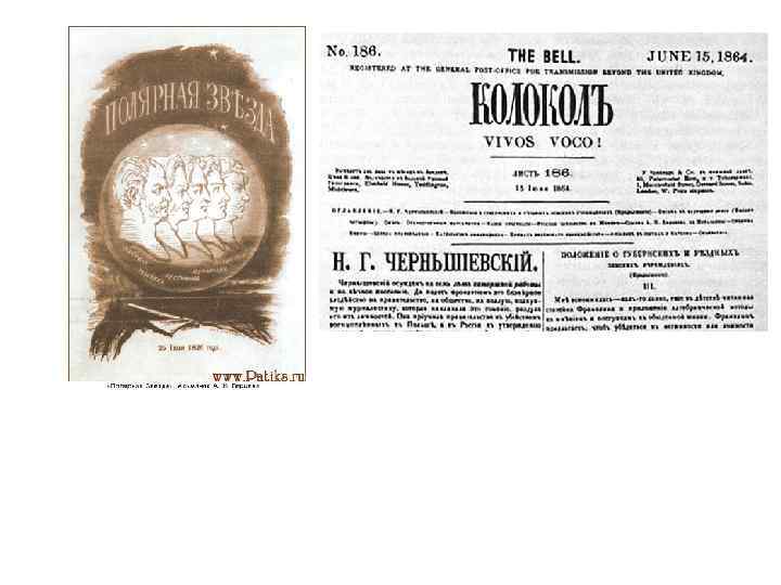Деятельность Герцена в эмиграции • 1847 – основал Вольную русскую типографию в Лондоне • 8 альманахов «Полярная звезда» • Газета «Колокол»