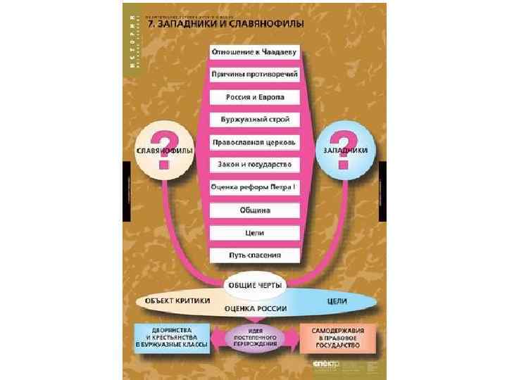 Западники и славянофилы, различие Взгляды Славянофилы Западники Историческое развитие России Особый путь развития, его нарушил Петр I Европейский путь развития, Петр сблизил Россию с Европой Государственный строй «Власть царю – народу Конституционная мнение» . Допетровская ( монархия сословно – представительная ) монархия Идеалы Соборность, сохранение крестьянской общины Права и свободы личности