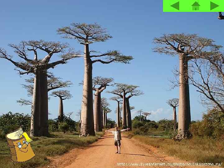 Баобаб "Чайник", произрастающий на Мадагаскаре. Утолщённые стволы этих деревьев являются прекрасным резервуаром для запасов воды на время засухи. Стволы некоторых баобабов настолько велики, что используются людьми в качестве жилищ.