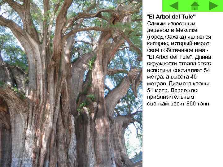 "El Arbol del Tule" Самым известным деревом в Мексике (город Оахака) является кипарис, который имеет своё собственное имя - "El Arbol del Tule". Длина окружности ствола этого исполина составляет 54 метра, а высота 40 метров. Диаметр кроны 51 метр. Дерево по приблизительным оценкам весит 600 тонн.