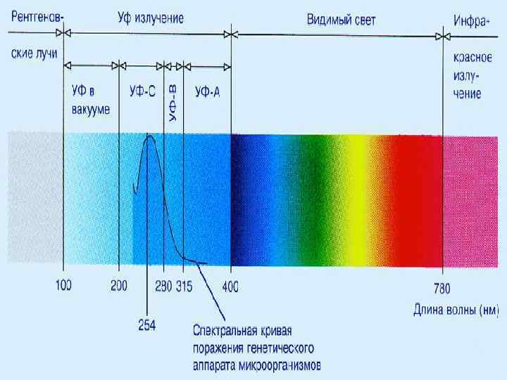 Область С обладает выраженным бактерицидным действием, максимум которого приходится на длину волны 254 нм.