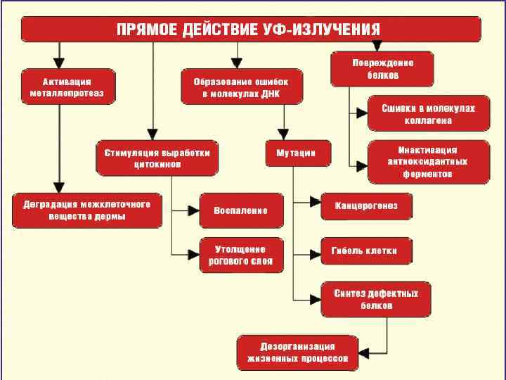 Патологическое действие УФ-излучения: Избыточное УФ-облучение незагоревшей кожи вызывает ее фотохимический ожог, сопровождающийся развитием эритемы и волдырной реакции на коже, повышением температуры тела, головной болью, общим болезненным состоянием.