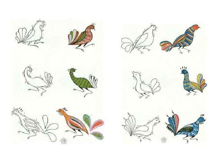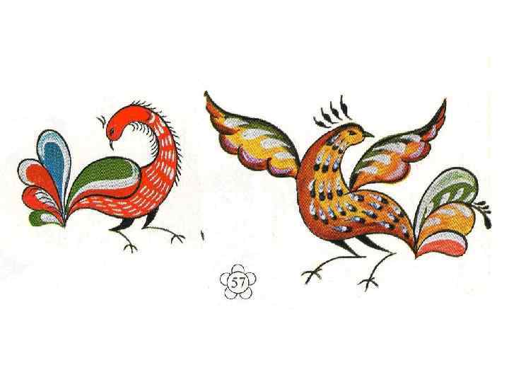 Композиция росписи всегда одна и та же - это гибкая веточка, несущая легкий цветок (тюльпаны-лилии, "котлы", "лунники", репей, ромашки), раскинувшиеся опушенные ресничками листья, несколько ягод; птички-"кутеньки" в различных позах: важно расхаживающие, клюющие, охорашивающие перышки, готовящиеся взлететь. Мастера уфтюжской росписи перенесли эти мотивы и на прялки.