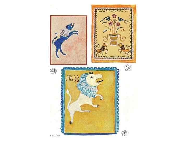 Уфтюжская домовая роспись В уфтюжской домовой росписи среди диковинных цветов уживались и птицы, и заморские звери. На филенках печного заборья можно встретить изображение льва - "зверины": синий лев с белой гривой расположился по диагонали во всю входную дверь и бросается на тех, кто берется за ручку двери, или небольшие оранжевые львы на красном фоне, вздыбленные по сторонам вазона с цветами, охраняют двери в подпечек - жилище домового. Выполненные на красно-оранжевом фоне, характерном для Русского Севера, где так мало солнечных дней, росписи служат напоминанием о лете.