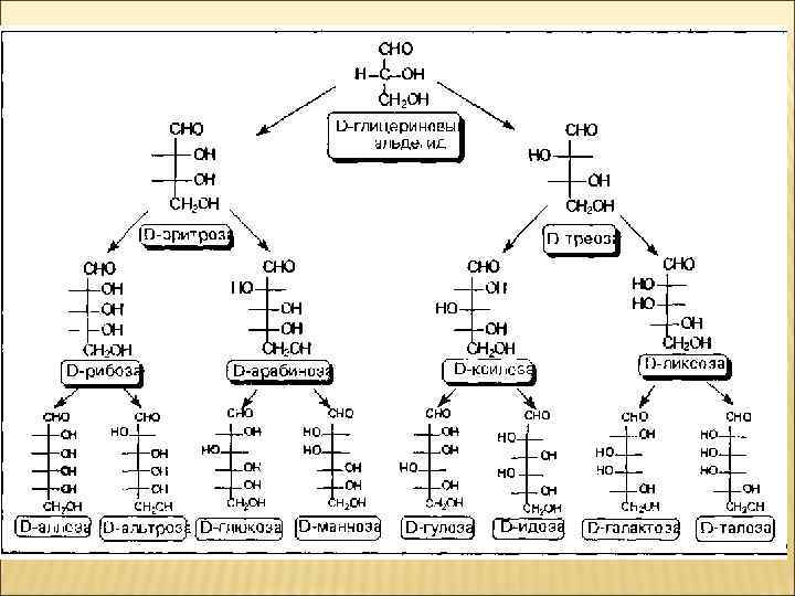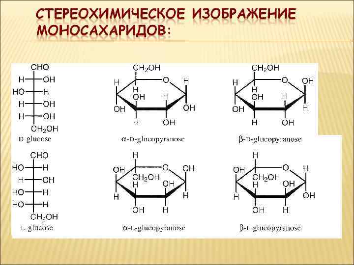 СТРОЕНИЕ МОНОСАХАРИДОВ Cn H 2 n. On или Cn(H 2 O)n CHO HO H CH 2 OH L-глицериновый альдегид альдозы D-ряда CHO H OH CH 2 OH D-глицериновый альдегид CHO OH OH CH 2 OH D-эритроза CHO HO OH CH 2 OH D-треоза CHO HO OH OH CH 2 OH D-рибоза D-арабиноза D-глюкоза D-манноза L-ряд D-ксилоза HO HO OH CH 2 OH D-ликсоза D-галактоза D-талоза
