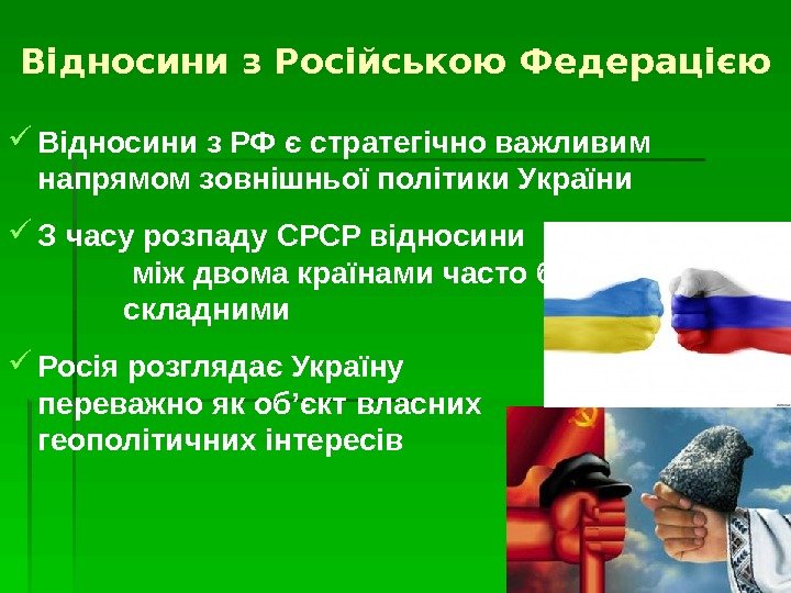 Відносини з Російською Федерацією Відносини з РФ є стратегічно важливим напрямом зовнішньої політики України З часу розпаду СРСР відносини між двома країнами часто були складними Росія розглядає Україну переважно як об’єкт власних геополітичних інтересів