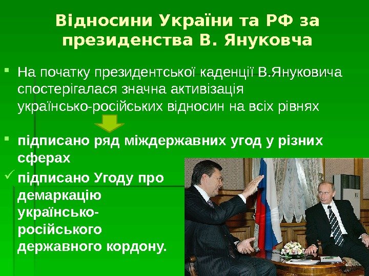 Відносини України та РФ за президенства В. Януковча На початку президентської каденції В. Януковича спостерігалася значна активізація українсько-російських відносин на всіх рівнях підписано ряд міждержавних угод у різних сферах підписано Угоду про демаркацію українсько- російського державного кордону.