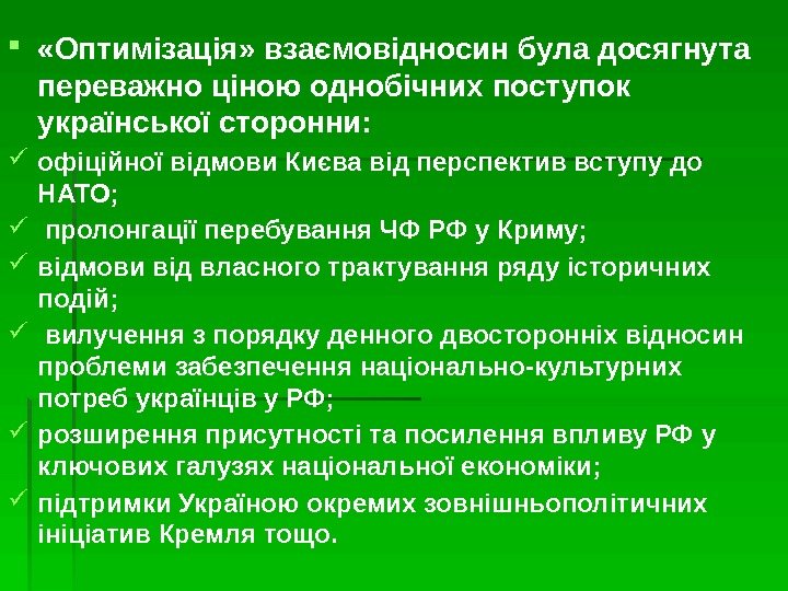 «Оптимізація» взаємовідносин була досягнута переважно ціною однобічних поступок української сторонни: офіційної відмови Києва від перспектив вступу до НАТО; пролонгації перебування ЧФ РФ у Криму; відмови від власного трактування ряду історичних подій; вилучення з порядку денного двосторонніх відносин проблеми забезпечення національно-культурних потреб українців у РФ; розширення присутності та посилення впливу РФ у ключових галузях національної економіки; підтримки Україною окремих зовнішньополітичних ініціатив Кремля тощо.