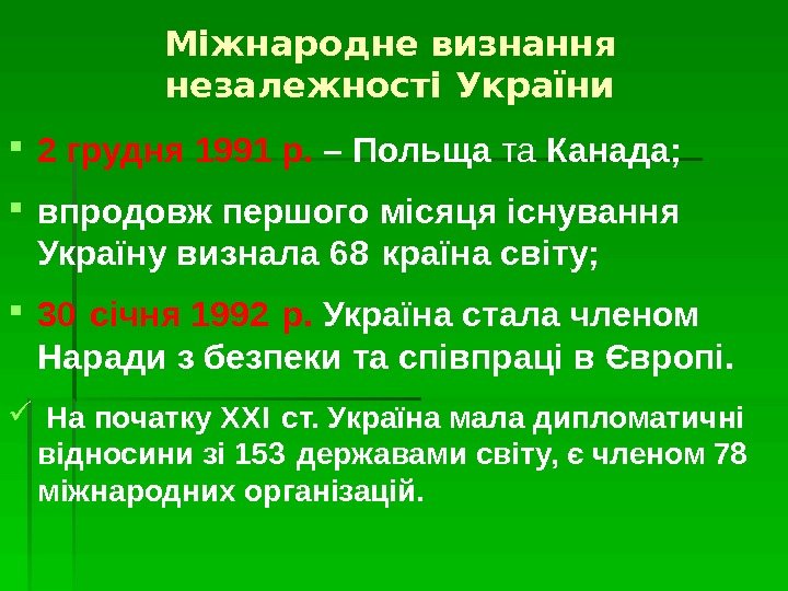 Міжнародне визнання незалежності України 2 грудня 1991 р. – Польща та Канада; впродовж першого місяця існування Україну визнала 68 країна світу; 30 січня 1992 р. Україна стала членом Наради з безпеки та співпраці в Європі. На початку ХХІ ст. Україна мала дипломатичні відносини зі 153 державами світу, є членом 78 міжнародних організацій.