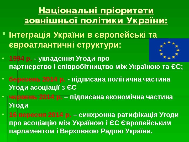 Національні пріоритети зовнішньої політики України: Інтеграція України в європейські та євроатлантичні структури: • 1994 р. — укладення Угоди про партнерство і співробітництво між Україною та ЄС; • березень 2014 р. — підписана політична частина Угоди асоціації з ЄС • червень 2014 р. – підписана економічна частина Угоди • 16 вересня 2014 р. – синхронна ратифікація Угоди про асоціацію між Україною і ЄС Європейським парламентом і Верховною Радою України.